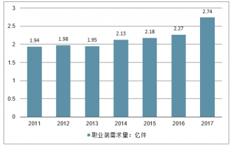 2017年我國(guó)男裝職業(yè)裝需求量約2.74億件,同比2016年的2.27億件增長(zhǎng)了20.7%。