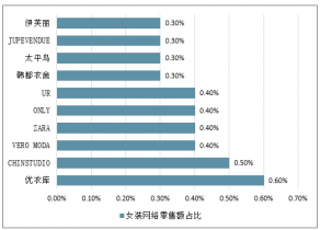 2019年3月女裝網(wǎng)絡(luò)零售TOP10品牌分別是:優(yōu)衣庫(kù)、CHINSTUDIO、VERO MODA、ZARA、ONLY、UR、韓都衣舍、太平鳥(niǎo)、JUPEVENDUE、伊芙麗。其中,優(yōu)衣庫(kù)品牌女裝市場(chǎng)占比最大,3月其網(wǎng)絡(luò)零售市場(chǎng)份額占比達(dá)到0.6%。其次,CHINSTUDIO品牌女裝則位居第二,占比為0.5%。