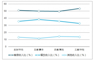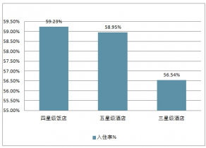 2019年2月,全國星級酒店平均出租率為58.24%,比上月提高8.13%。平均房價為354.73元,每間可供房收入為207.56元;客房收入占比51.13%,餐飲收入占比35.59%。2019年3月份三星及以上星級飯店的客房平均入住率為58.24%,其中四星級飯店的入住率最高達59.23%,五星級酒店平均入住率為58.95%,三星級酒店入住率達56.54%。3月份平均房價354.73元,五星級與四星級的房價平均相差150.7元。