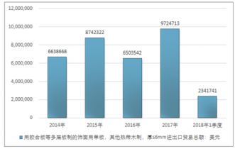 2016年我國用膠合板等多層板制的飾面用單板,其他熱帶木制,厚≤6mm進(jìn)出口貿(mào)易總額6503542美元,2017年進(jìn)出口貿(mào)易總額9724713美元;2018年1季度進(jìn)出口貿(mào)易總額2341741美元。