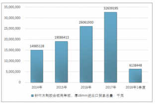 2016年我國(guó)針葉木制膠合板用單板,厚≤6mm進(jìn)出口貿(mào)易總量26061930千克,2017年進(jìn)出口貿(mào)易總量32639195千克;2018年1季度進(jìn)出口貿(mào)易總量6138448千克。