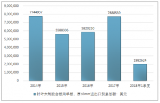 2016年我國(guó)針葉木制膠合板用單板,厚≤6mm進(jìn)出口貿(mào)易總額5820230美元,2017年進(jìn)出口貿(mào)易總額7688539美元;2018年1季度進(jìn)出口貿(mào)易總額1982624美元。