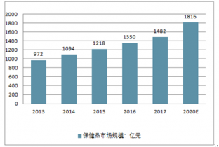2014年中國保健品市場規(guī)模突破千億,2017年中國保健品市場規(guī)模逼近1500億。預(yù)計(jì)2020年中國保健品市場規(guī)模將達(dá)1816億元,其中市場前景十分廣闊。