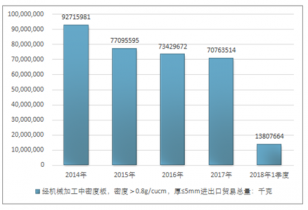 2016年我國經(jīng)機械加工中密度板,密度>0.8g/cucm,厚≤5mm進出口貿(mào)易總量73429672千克,2017年進出口貿(mào)易總量70763514千克;2018年1季度進出口貿(mào)易總量13807664千克。