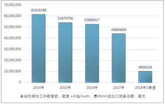 2016年我國經(jīng)機械加工中密度板,密度>0.8g/cucm,厚≤5mm進出口貿(mào)易總額52600017美元,2017年進出口貿(mào)易總額43854694美元;2018年1季度進出口貿(mào)易總額9939155美元。