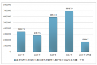 2016年我國(guó)輻射松制托板箱形托盤(pán)及其他裝載板托盤(pán)護(hù)框進(jìn)出口貿(mào)易總額435815美元,2017年進(jìn)出口貿(mào)易總額563264美元;2018年1季度進(jìn)出口貿(mào)易總額148593美元。