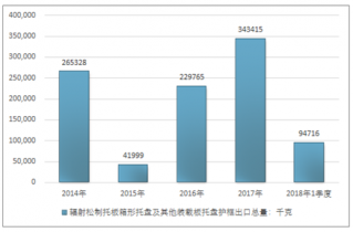2016年我國(guó)輻射松制托板箱形托盤(pán)及其他裝載板托盤(pán)護(hù)框出口總量229765千克,2017年出口總量343415千克;2018年1季度出口總量94716千克。
