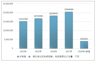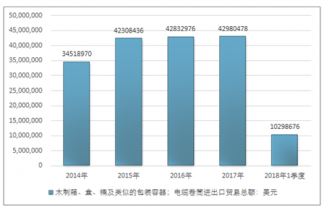 2016年我國木制箱、盒、桶及類似的包裝容器;電纜卷筒進(jìn)出口貿(mào)易總額42832976美元,2017年進(jìn)出口貿(mào)易總額42980478美元;2018年1季度進(jìn)出口貿(mào)易總額10298676美元。