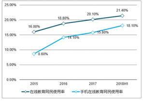 2015-2018年中國(guó)在線教育網(wǎng)民使用率及手機(jī)教育網(wǎng)民使用率