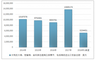 2016年我國木制的大桶、琵琶桶、盆和其他箍桶及其零件,包括桶板進(jìn)出口貿(mào)易總額9003761美元,2017年進(jìn)出口貿(mào)易總額13695174美元;2018年1季度進(jìn)出口貿(mào)易總額5234451美元。