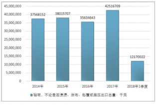 2016年我國氈呢,不論是否浸漬、涂布、包覆或?qū)訅撼隹诳偭?5634643千克,2017年出口總量42516709千克;2018年1季度出口總量12170022千克。