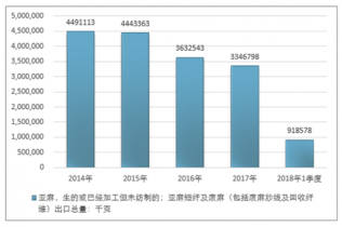 2016年我國亞麻,生的或已經(jīng)加工但未紡制的;亞麻短纖及廢麻(包括廢麻紗線及回收纖維)出口總量3632543千克,2017年出口總量3346798千克;2018年1季度出口總量918578千克。