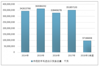 2016年我國未梳的羊毛進(jìn)口總量316541051千克,2017年進(jìn)口總量343727399千克;2018年1季度進(jìn)口總量95302059千克。