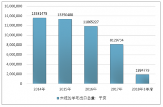 2016年我國未梳的羊毛出口總量11865227千克,2017年出口總量8129734千克;2018年1季度出口總量1884779千克。