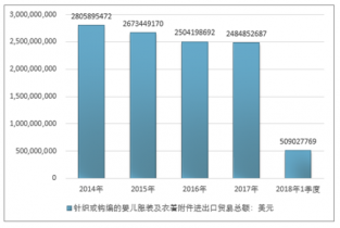 2016年我國(guó)針織或鉤編的嬰兒服裝及衣著附件進(jìn)出口貿(mào)易總額2504198692美元,2017年進(jìn)出口貿(mào)易總額2484852687美元;2018年1季度進(jìn)出口貿(mào)易總額509027769美元。