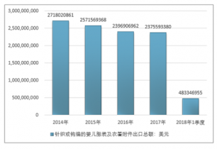2016年我國(guó)針織或鉤編的嬰兒服裝及衣著附件出口總額2396906962美元,2017年出口總額2375593380美元;2018年1季度出口總額483346955美元。