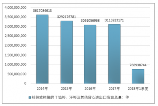 2016年我國針織或鉤編的T恤衫、汗衫及其他背心出口總量2947656707件,2017年出口總量2964648129件;2018年1季度出口總量718404136件。