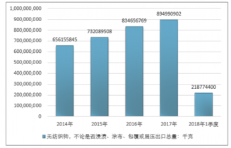 2016年我國無紡織物,不論是否浸漬、涂布、包覆或?qū)訅撼隹诳偭?34656769千克,2017年出口總量894990902千克;2018年1季度出口總量218774400千克。