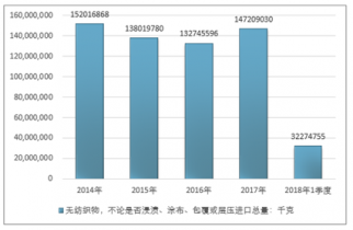 2016年我國無紡織物,不論是否浸漬、涂布、包覆或?qū)訅哼M(jìn)口總量132745596千克,2017年進(jìn)口總量147209030千克;2018年1季度進(jìn)口總量32274755千克。