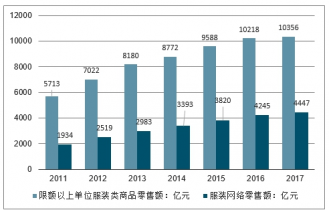 2011-2017年中國(guó)限額以上單位服裝類商品零售額及服裝網(wǎng)絡(luò)零售額情況