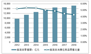 2012-2018年全國服裝類零售額及在商品零售比重情況