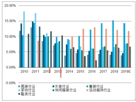 2010-2019年中國(guó)紡織服裝細(xì)分行業(yè)市場(chǎng)規(guī)模增速呈現(xiàn)分化