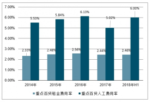 2014-2019年 半年重點百貨百貨公司租金費用率及人工費用率情況(%)