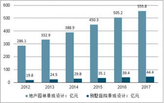 2012到2017年間我國的景觀設(shè)計(jì)行業(yè)的市場規(guī)模發(fā)展迅速,2017年的2535.3億元,其中地產(chǎn)園林景觀設(shè)計(jì)為555.8億元。別墅庭院景觀設(shè)計(jì)隨著地產(chǎn)園林景觀設(shè)計(jì)規(guī)模增長快速發(fā)展,從2012年的19.8億元增長到2017年的44.4億元,如下圖所示: