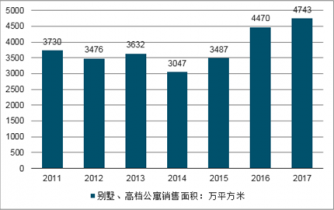 2011-2017年全國別墅、高檔公寓銷售面積走勢(shì)圖