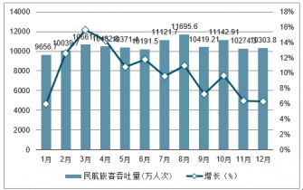 2019年1-12月民航旅客吞吐量及增長(zhǎng)走勢(shì)