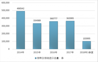 2016年我國領帶及領結進口總量360777條,2017年進口總量363995條;2018年1季度進口總量103995條。