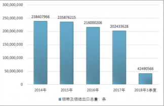 2016年我國領帶及領結進出口貿易總量216360983條,2017年進出口貿易總量202797623條;2018年1季度進出口貿易總量42594561條。
