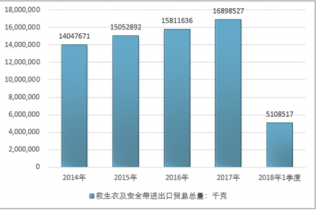 2016年我國救生衣及安全帶進出口貿易總量15811636千克,2017年進出口貿易總量16898527千克;2018年1季度進出口貿易總量5108517千克。