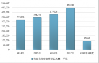 2016年我國救生衣及安全帶進口總量377925千克,2017年進口總量447237千克;2018年1季度進口總量95658千克。