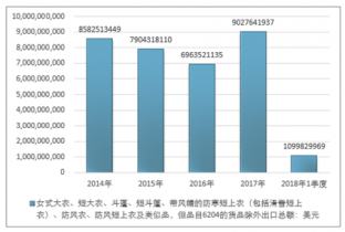 2016年我國女式大衣、短大衣、斗蓬、短斗篷、帶風帽的防寒短上衣(包括滑雪短上衣)、防風衣、防風短上衣及類似品,但品目6204的貨品除外出口總額6963521135美元,2017年出口總額9027641937美元;2018年1季度出口總額1099829969美元。