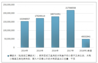 2016年我國(guó)鑲嵌木(包括細(xì)工鑲嵌木);裝珠寶或刀具用的木制盒子和小匣子及類似品;木制小雕像及其他裝飾品;第九十四章以外的木制家具進(jìn)出口貿(mào)易總額950996581美元,2017年進(jìn)出口貿(mào)易總額1101860867美元;2019年1季度進(jìn)出口貿(mào)易總額246860737美元。