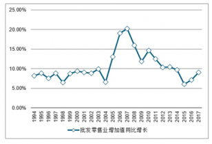 1994-2017年中國批發(fā)零售業(yè)增加值同比增長走勢