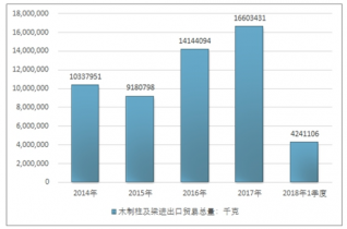 2016年我國木制柱及梁進(jìn)出口貿(mào)易總量14144094千克,2017年進(jìn)出口貿(mào)易總量16603431千克;2019年1季度進(jìn)出口貿(mào)易總量4241106千克。