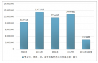 2016年我國強(qiáng)化木,成塊、板、條或異型的進(jìn)出口貿(mào)易總額9734652美元,2017年進(jìn)出口貿(mào)易總額10804861美元;2019年1季度進(jìn)出口貿(mào)易總額2929488美元。