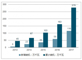 2013-2017年中國(guó)海上風(fēng)電新增及累計(jì)裝機(jī)容量(單位:萬(wàn)千瓦)