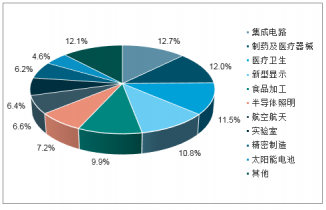 從應(yīng)用領(lǐng)域來看,目前的中國的工業(yè)潔凈室主要應(yīng)用于食品藥品加工、微電子等領(lǐng)域,醫(yī)藥衛(wèi)生以及新型的顯示等領(lǐng)域。其中集成電路制造占比最大,達(dá)到了12.7%,制藥及醫(yī)療器械占比達(dá)到了12.0%。