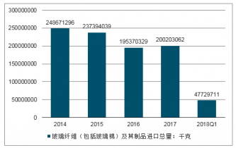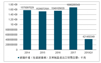 2016年我國玻璃纖維(包括玻璃棉)及其制品(例如,玻璃纖維紗線及其織物)進出口貿易總量1549105635千克 ,2017年進出口貿易總量1686205543千克 ;2018年1季度進出口貿易總量421450349千克 。