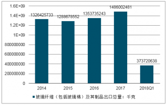 2016年我國玻璃纖維(包括玻璃棉)及其制品(例如,玻璃纖維紗線及其織物)出口總量1353735243千克 ,2017年出口總量1486002481千克 ;2018年1季度出口總量373720638千克 。