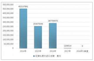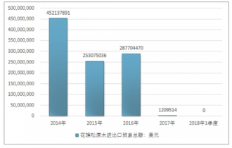 2014-2018年1季度花旗松原木進(jìn)口貿(mào)易總額走勢圖(單位:美元)