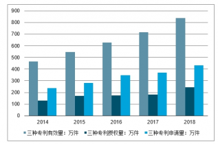 2019年中國(guó)有專利申請(qǐng)企業(yè)較上年新增6.0萬(wàn)家,對(duì)國(guó)內(nèi)發(fā)明專利申請(qǐng)?jiān)鲩L(zhǎng)的貢獻(xiàn)率達(dá)到73.2%。根據(jù)國(guó)家知識(shí)產(chǎn)權(quán)局?jǐn)?shù)據(jù)顯示,2019年我國(guó)發(fā)明專利、實(shí)用新型專利以及外觀設(shè)計(jì)專利三種專利申請(qǐng)量總數(shù)達(dá)432.3萬(wàn)件,同比增長(zhǎng)了16.9%。2019年我國(guó)國(guó)內(nèi)發(fā)明專利授權(quán)平均權(quán)利要求項(xiàng)數(shù)為8.3項(xiàng),國(guó)內(nèi)有效發(fā)明專利平均維持年限為6.4年,2014-2019年我國(guó)三種專利授權(quán)量總數(shù)增長(zhǎng)迅速,從2014年專利授權(quán)總量為130萬(wàn)件到2019年達(dá)到244.7萬(wàn)件。2019年我國(guó)三種專利有效量達(dá)838.1萬(wàn)件,同比增長(zhǎng)17.3%。