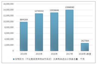 2016年我國(guó)壓制軟木(不論是否使用粘合劑壓成)及其制品進(jìn)出口貿(mào)易總量13026646千克,2017年進(jìn)出口貿(mào)易總量13998580千克;2019年1季度進(jìn)出口貿(mào)易總量2627064千克。