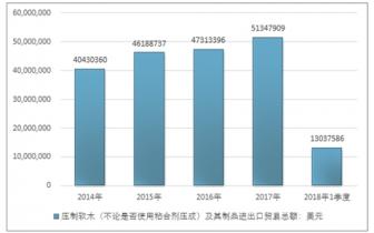 2016年我國(guó)壓制軟木(不論是否使用粘合劑壓成)及其制品進(jìn)出口貿(mào)易總額47313396美元,2017年進(jìn)出口貿(mào)易總額51347909美元;2019年1季度進(jìn)出口貿(mào)易總額13037586美元。