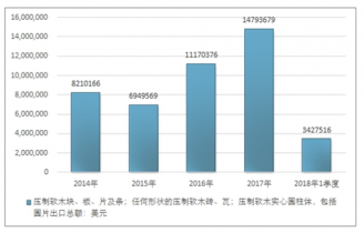 2016年我國壓制軟木塊、板、片及條;任何形狀的壓制軟木磚、瓦;壓制軟木實(shí)心圓柱體,包括圓片出口總額11170376美元,2017年出口總額14793679美元;2019年1季度出口總額3427516美元。