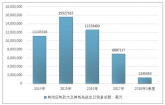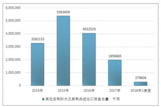 2016年我國其他壓制軟木及其制品品進(jìn)出口貿(mào)易總額12523490美元,2017年進(jìn)出口貿(mào)易總額6897117美元;2019年1季度進(jìn)出口貿(mào)易總額1345450美元。