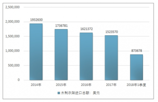 2016年我國木制衣架進口總額1621372美元,2017年進口總額1523570美元;2019年1季度進口總額873678美元。